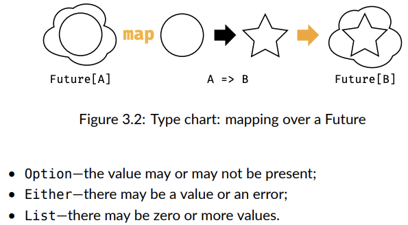 퓨처는 연속적인 비동기적 연산을 큐에 넣어서 이전의 것이 끝나면 그 다음것이 적용될 수 있도록 해주는 펑터이다. 3,2그림에 표시되어있는 그것의 map method의 타입 시그니처를 보면 모두 같은 맥락의 모양이라고 할 수 있다. 그러나 실질적인 동작 자체는 아주 다르다.