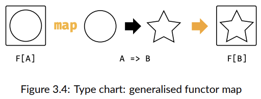 우리가 지금까지 본 예시는 전부 펑터였다. 연속적인 연산을 캡슐화하는 클래스 말이다. 공식적으로는 functor은 (A=>B) => F[B] 인 map 연산이 정의되어 있는 type F[A] 를 의미한다. 일반적인 타입 차트는 그림 3.4에 있다. Cats는 펑터를 cats.Functor에 있는 타입클래스로 인코딩한다. 그래서, 메소드가 조금 다르게 생겼다. 이친구는 초기 F[A]를 파라미터와 함께 적용할 변환 함수를 받는다. 아래에 단순화된 버전의 정의가 있다.
