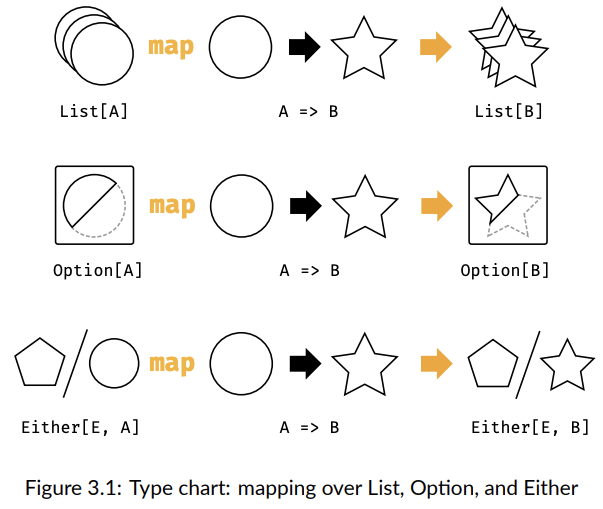 비슷하게, 우리가 옵션을 map할때, Some None은 그대로 놔두고 변경한다. Either도 왼쪽 오른쪽 컨텍스트는 그대로 놔두고 안의 원소만 변경한다. 3.1 그림 보면 직관적이다. 다른 데이터 타입들에 걸쳐있는 맵의 동작을 표현한 것.