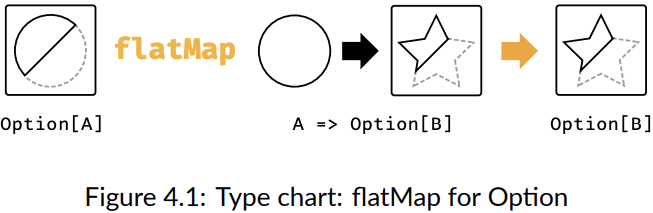 여기에 모나드가 필요하다. 모나드의 flatMap 메소드는 다음에 무슨 일이 일어날지 특정해주고, 중간의 문제를 고려할 수 있게 해 준다. Option의 flatMap 메소드는 중간의 Option들을 고려한다. List의 flatMap은 List들의 중간을 고려한다. (등등..) flatmap은 계속 그 연산의 결과를 처리하고, 그 이후의 flatMap을 적용하는 연쇄적인 과정을 거쳐간다. 몇가지 예시를 살펴보자.