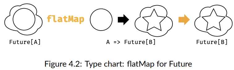 우리의 시퀀스의 퓨처는 이전 퓨처들의 결과들로부터 전달받은 함수로부터 만들어졌다. 다른 말로는, 우리의 연산의 각 스텝은 이전의 스텝이 끝나야만 시작된다는 뜻이다. 그림 4.2에 표시되어있다. A => Future[B]로 가는 함수 파라미터를 받는다. (? 맞나..?)
