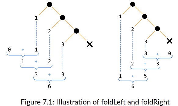 foldLeft 메소드는 시퀀스에 재귀적으로 동작한다. 우리의 이진 함수는 각 아이템에 대해 반복적으로 호출되고, 그 결과는 다음으로 축적된다. 마지막에 도달하면 전부 축적된 결과가 최종 결과가 된다.