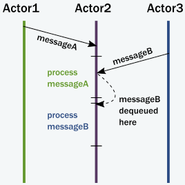 액터는 아무 일을 하지 않을 때는 어떤 리소스도 사용하지 않고 suspended state에 머물러 있는다. 그리고 메시지를 Mailbox에 받으면 그때 일을 시작한다.