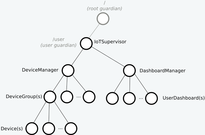- The top level supervisor actor represents the system component for devices. It is also the entry point to look up and create device group and device actors. (맨위 액터는 관리자로서, 디바이스를 위한 시스템 컴포넌트를 나타낸다.)