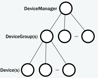 이전 섹션에서 설명한 원칙을 고려하여, device manager component를 다음과 같은 세 가지 level의 액터 트리로 모델링한다.
