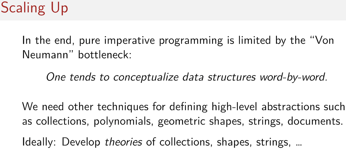 우리는 프로그램을 글자 하나하나에 매칭시켜려고 하지 않고, 좀더 큰 구조에서 사고하려고 한다. 라는 개념을 John Backus가 주장했다! (사실상 처음으로 고수준 언어의 발명자이다) 그렇게 포트란이 나왔으며, 시간이 좀 더 지나자, 전통적인 명령형 프로그래밍 동작이 힘을 잃고 새로운 필요성이 대두되었다. 그 때 제시된 것이 함수형 프로그래밍이다.
