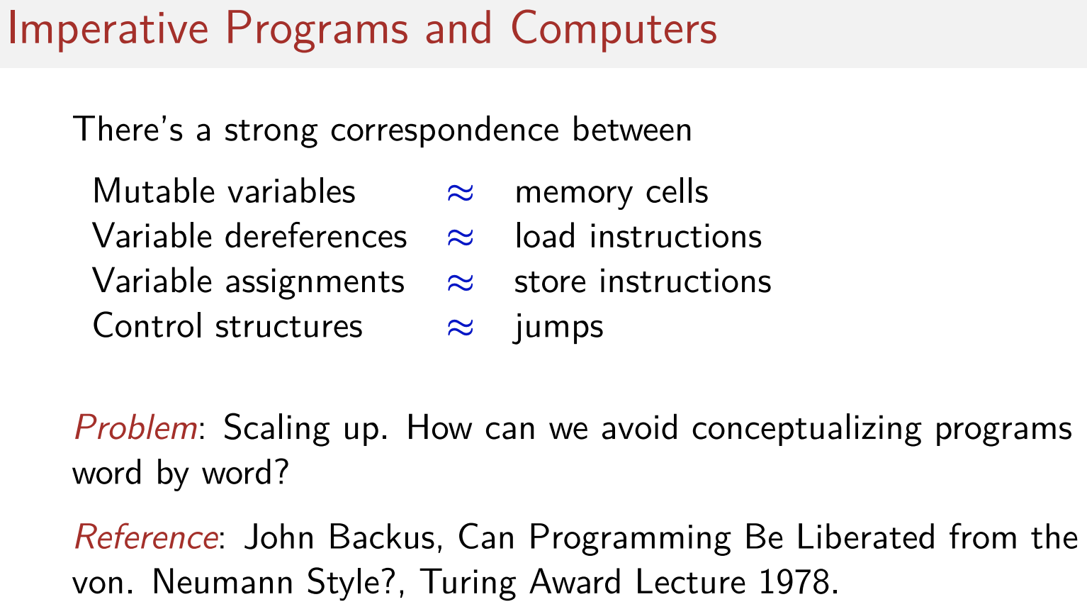 가장 잘 알려진 Imperative program은 폰 노이만 컴퓨터이다. 반드시 프로세서와 메모리로 구성되며, 메모리에서 프로세스로 넘겨주는 Bus가 있다.