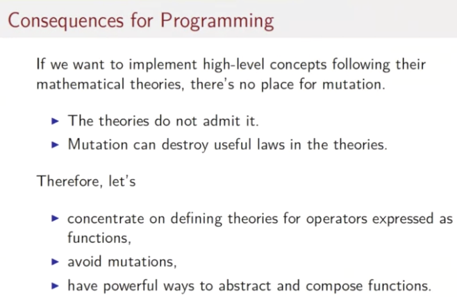 이것들이 수학적인 theory에 대해 살펴본 것이며, 만약 이를 수학적 이론에 맞게 high level로 구현하려 한다면 mutation은 일어나지 않아야 한다. 우선, theory는 mutation연산자를 갖도록 허용하지 않으며 만약 mutation을 사용하게 된다면 많은 유용한 theory laws를 파괴하게 된다.
