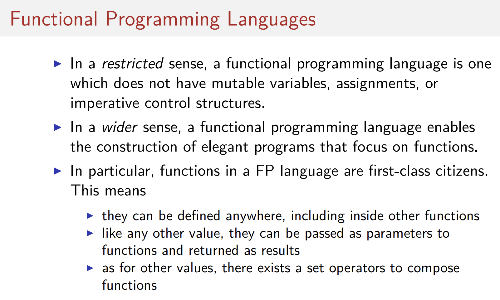 함수형 프로그래밍을 바라보는 두가지 관점이 있는데, 하나는 엄격한(restructed) 관점이고 하나는 관대한(wider) 관점이다.