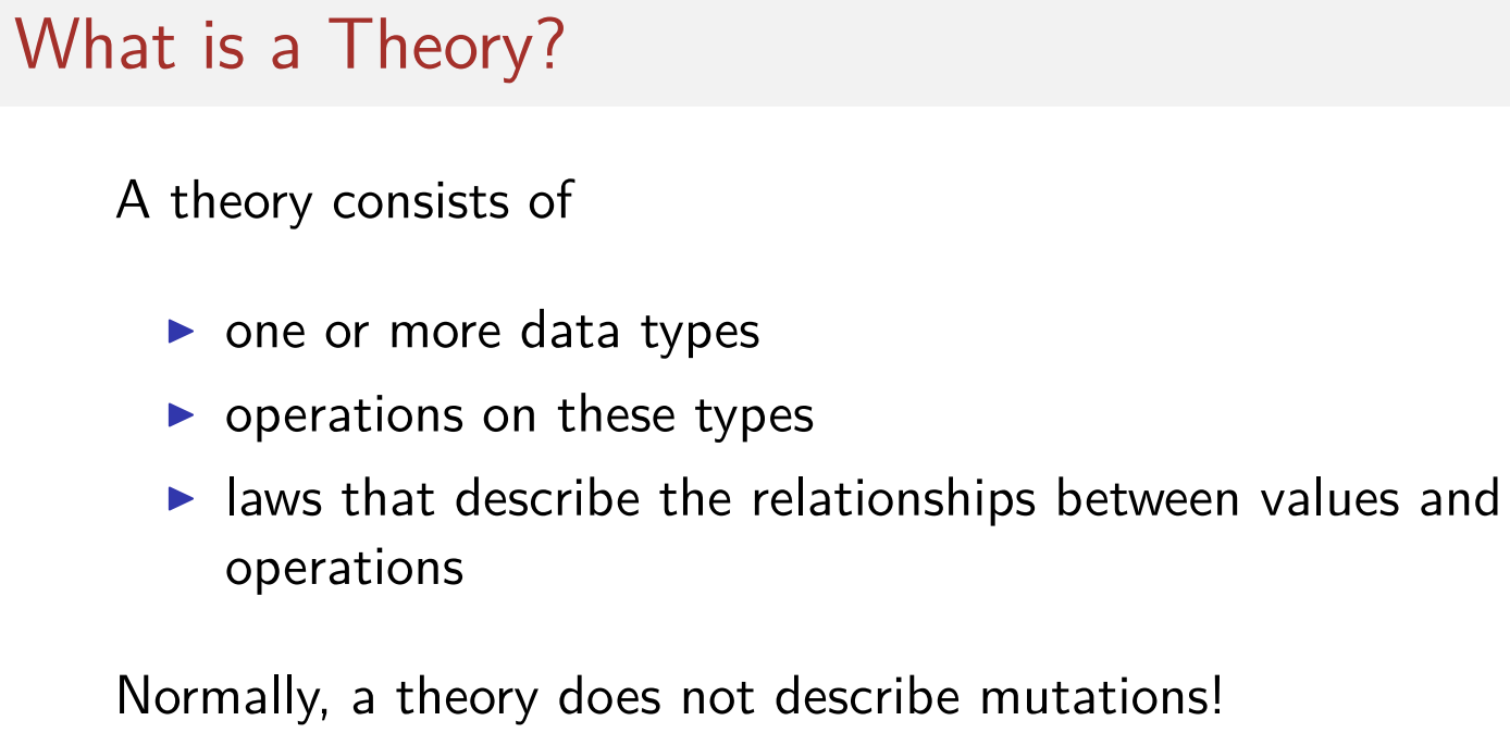 수학에서 Theory이란 하나 혹은 그 이상의 데이터 타입, 이 타입들에 대한 동작들, values와 operations사이의 관계를 설명할 수 있는 법칙들로 구성되어 있다. 여기에서 중요한 것은, 일반적으로 theory는 mutations에 대해 다루지 않는다는 것이다. mutation은 내가 무엇을 바꿨을 때, 그 정체성은 동일하게 유지되는 것을 의미한다.