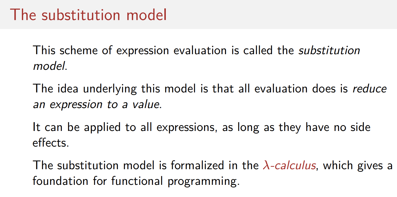 이 substitution model 은 함수형 프로그래밍의 기초가 되는 람다 칼큘러스에서 공식화되어 있다.