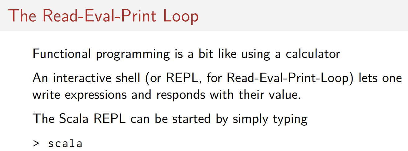 scala에서는 repl을 scala라고 치면 시작할 수 있다. (이 코스에서는 scala 대신 sbt console를 사용한다.)
