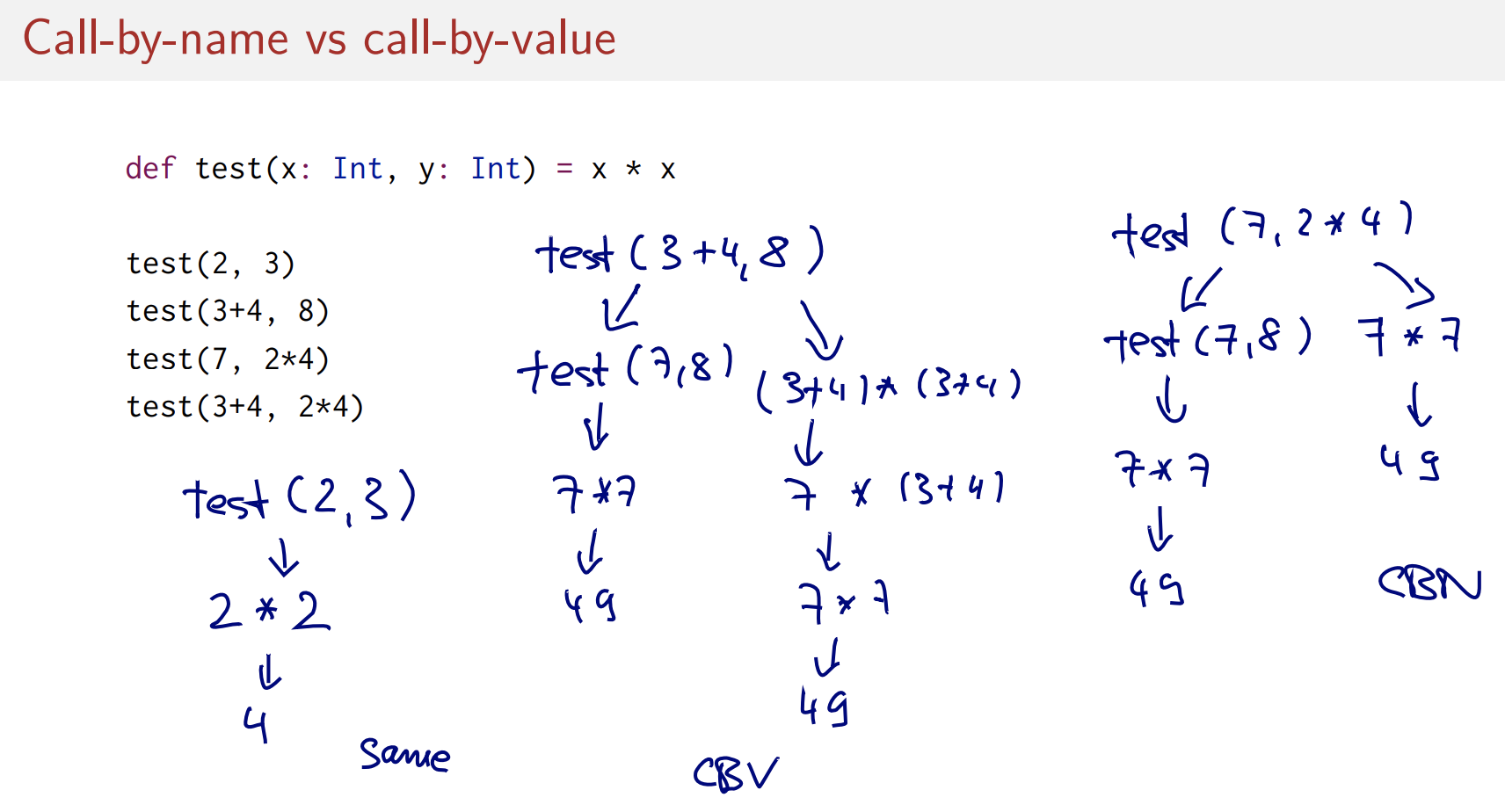 test(3+4, 8)의 경우 call by value가 더 빠르게 값을 계산한다.