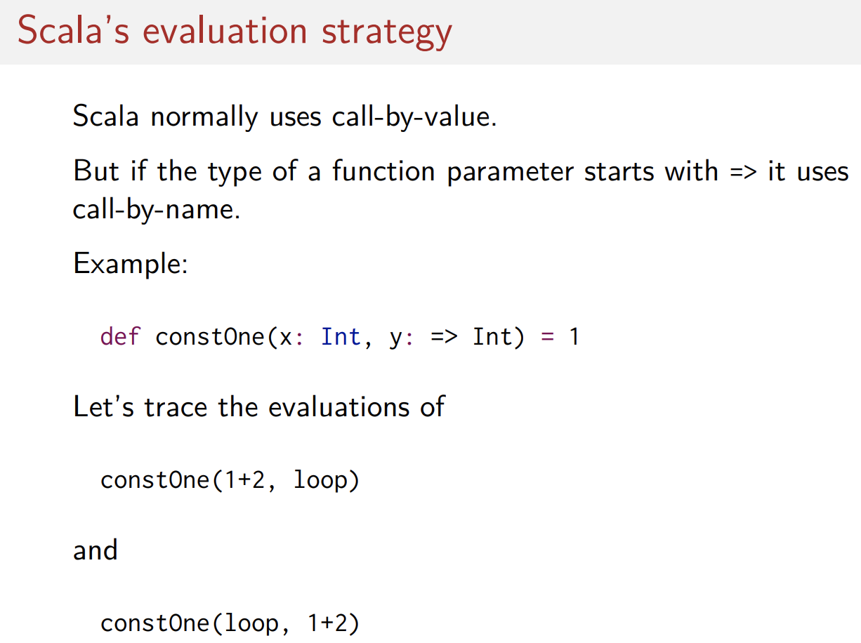 스칼라에서는 일반적으로 call-by-value를 쓴다. 종료될 수 있는 장점이 있기 때문에 call-by-name를 써야 할 것 같아 보이지만 일반적으로는 call-by-value를 통한 계산이 더 효율적인 경우가 많기 떄문이다. (반복 계산 X , 명령형 프로그래밍에서 사이드 이펙트 관련 이슈 등등)
