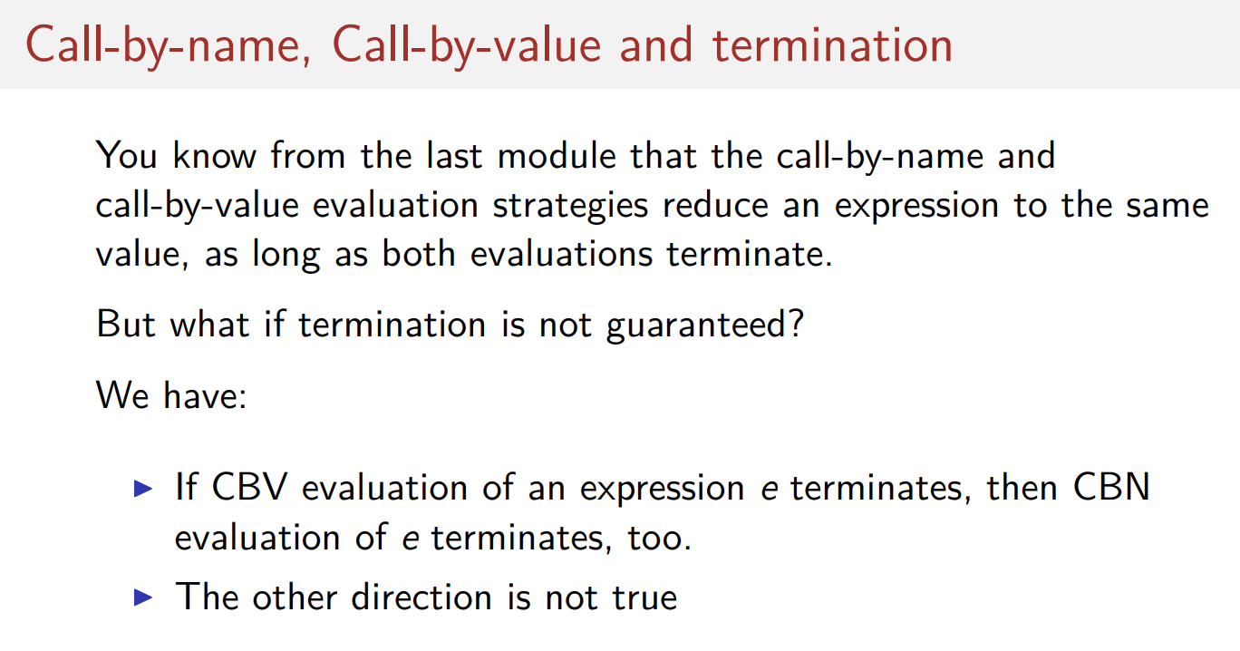 여기서 중요한 정리가 하나 있는데, call-by-value 연산이 종료 될 수 있다면, call-by-name도 종료될 수 있다. 그렇지만 call-by-name이 종료된다고해서 call-by-value가 종료될 수 있다는 것은 아니다. 한번 CallbyName에선 종료되지만 CallByValue에선 종료되지 않는 예시를 보자.