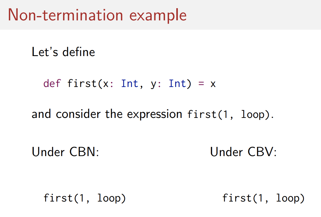 여기에서 y가 무한 loop이라면 x만 계산하는 call-by-name에 반해서 call-by-value는 무한히 돌아갈 것이다.