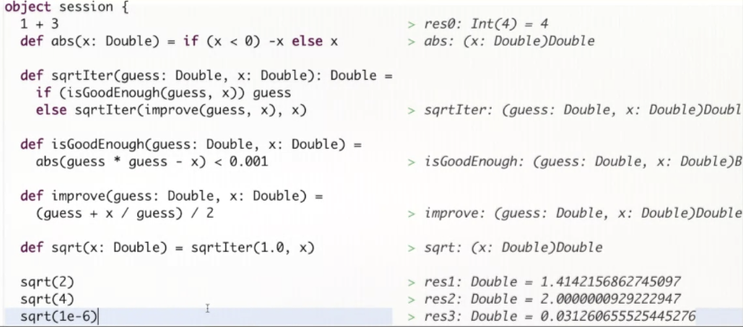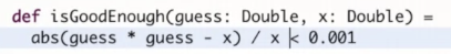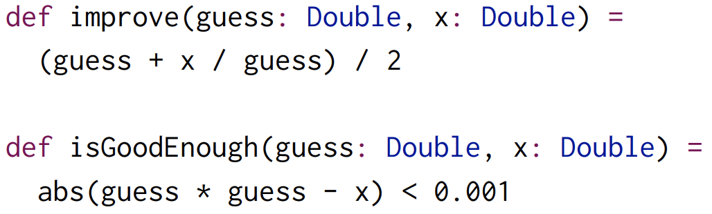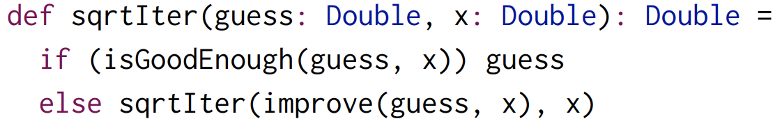 특히, 함수형 프로그래밍에서는 어떤 작업을 여러 작은 함수로 분할할 수 있다. 그렇지만, sqrtIter, improve, isGoodEnough 는 단순히