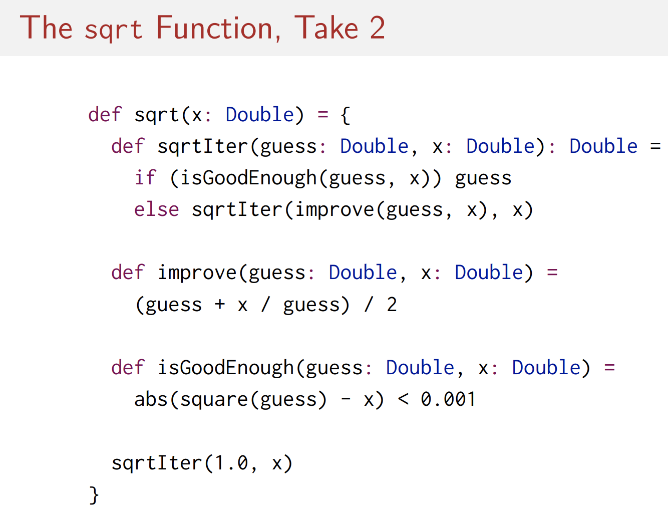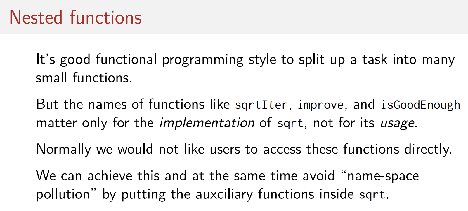 우리는 사용자들이 이런 함수를 직접적으로 호출하는 것을 원하지 않는다(의도하지 않았다). 그러므로 우리는 이 함수들을 sqrt함수 내부로 배치함으로써 name-space의 pollution(낭비)을 막으면서 우리의 의도대로 사용할 수 있게 된다.