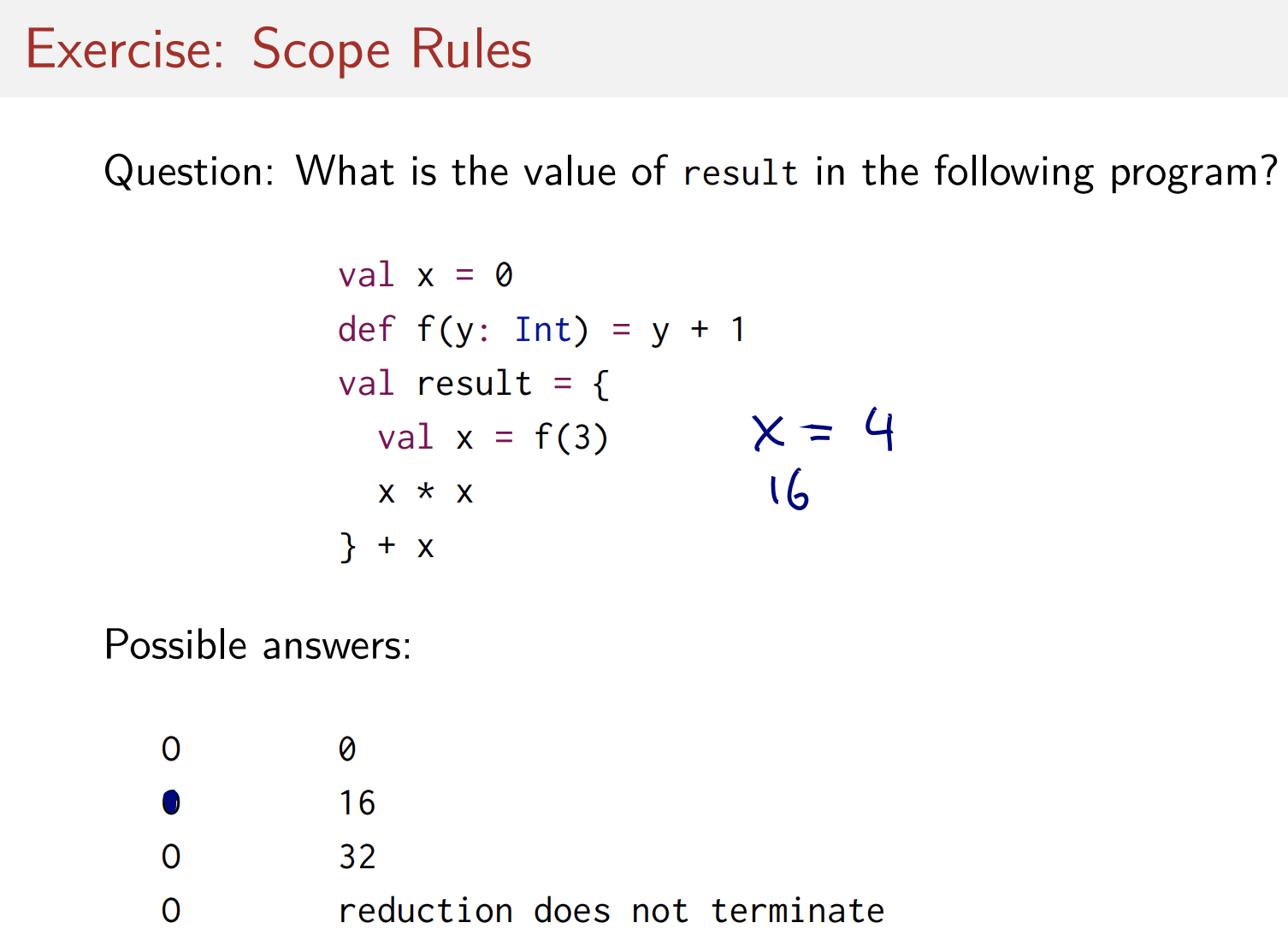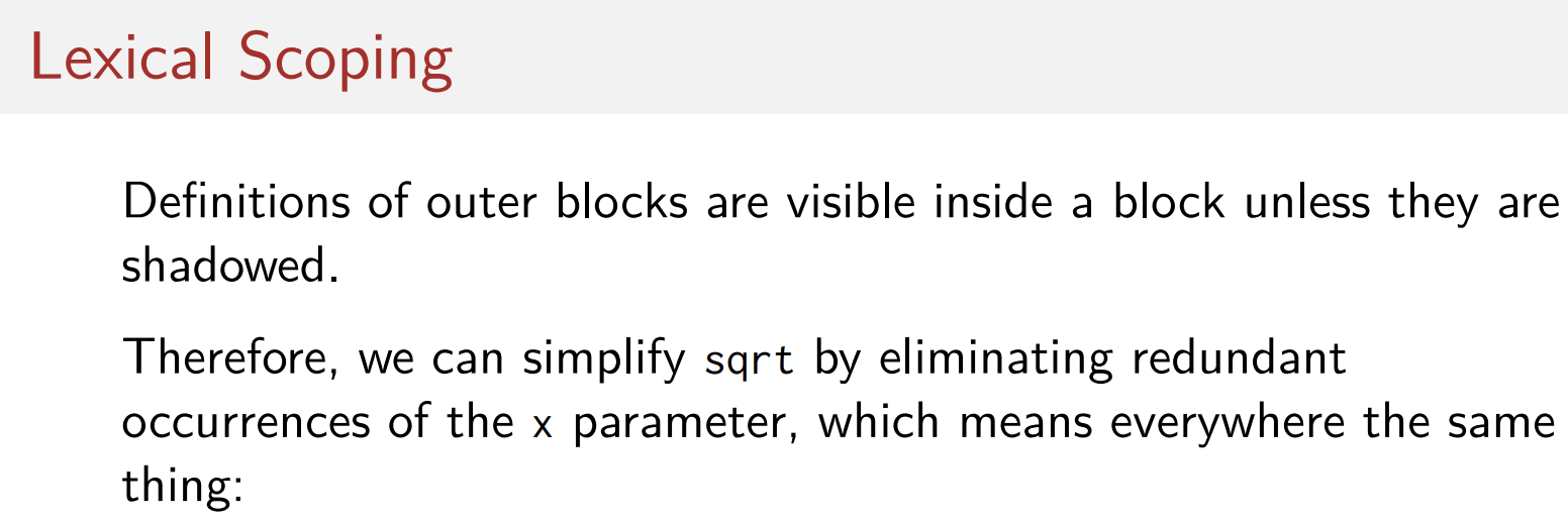- block안에서 정의된 정의들은 블록 밖의 같은 이름의 정의들을 shadow한다. (일시적으로 그 이름 대신 안쪽 이름의 새로운 정의를 참조한다는 뜻) 위의 예시에서 x는 shadowing된 x이다.