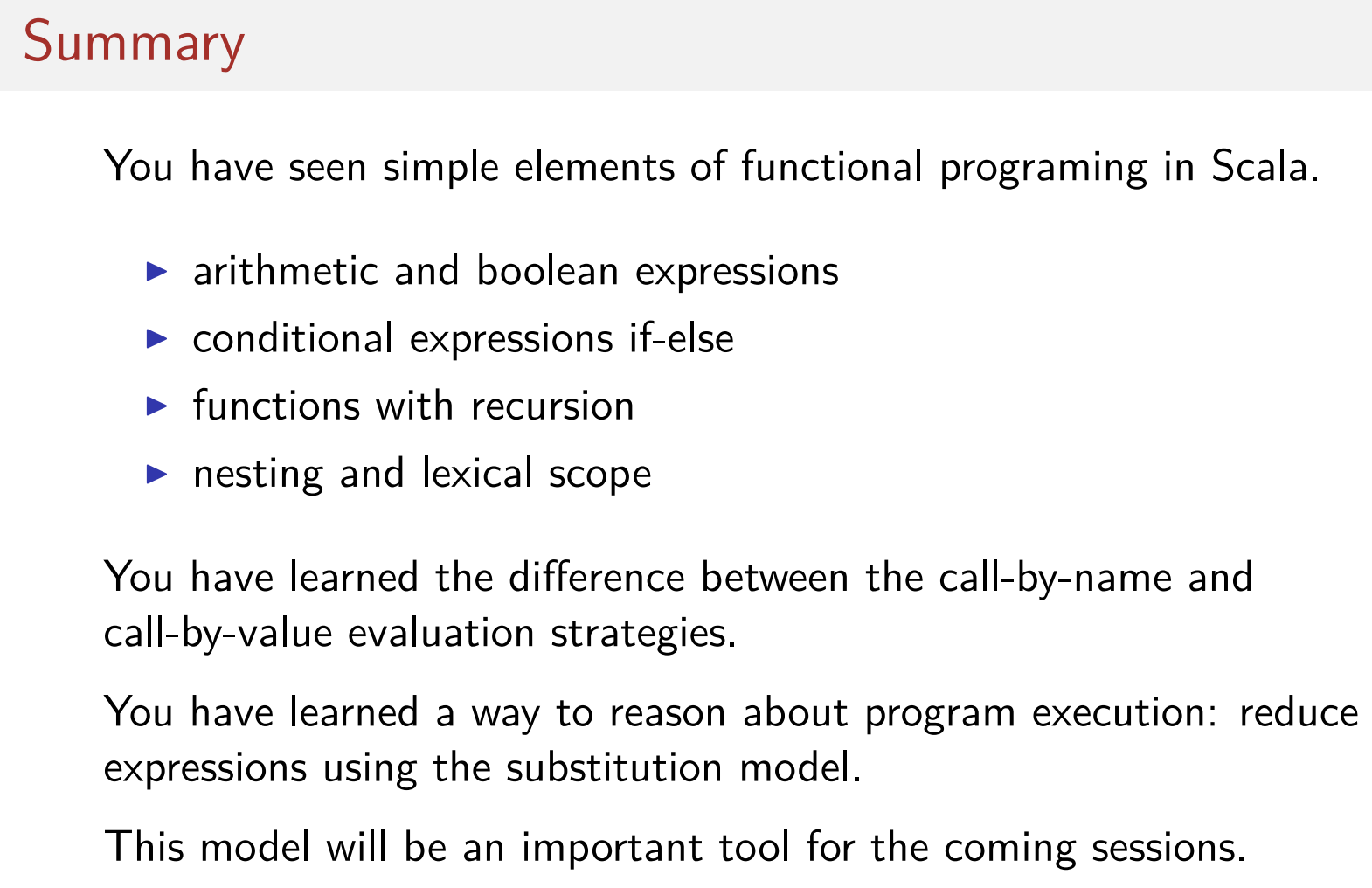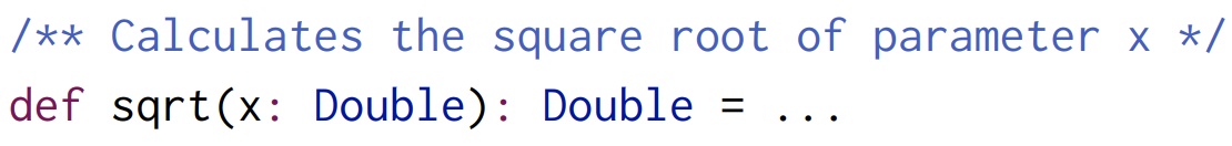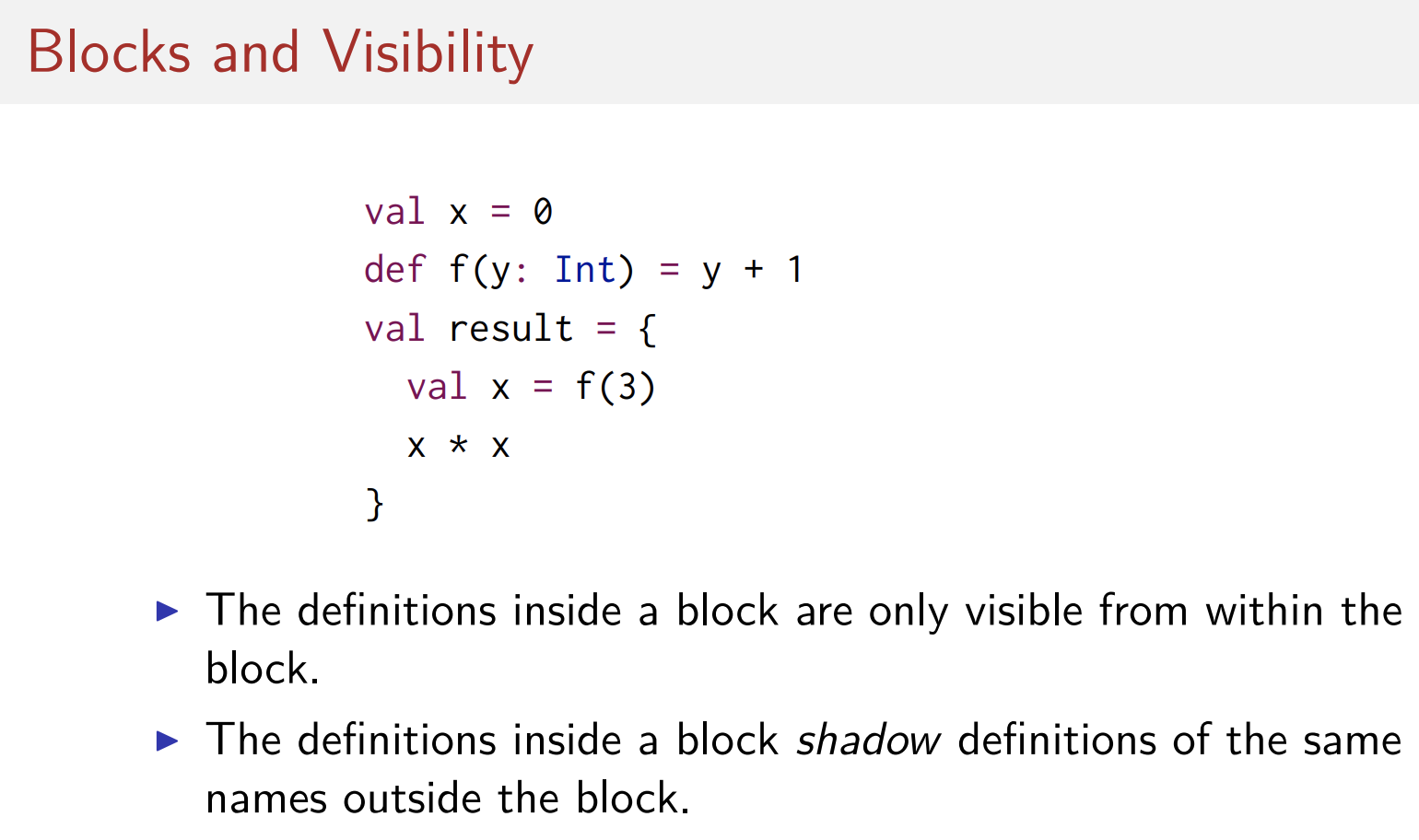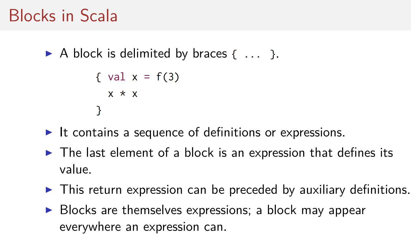 우리가 이렇게 한 것은 block을 사용한 것이다. block은 중괄호를 통해 범위가 정해지며 몇몇 정의에 해당하는 줄을 적을 수 있으며 마지막으로 해당 블록의 반환값을 반환한다. (위 예시에서는 x*x 부분) block은 스칼라의 표현식이며, 따라서 함수 정의의 우변을 포함하여 모든 부분에서 사용할 수 있다.