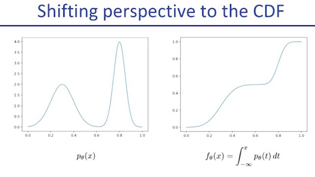 probability density function(PDF)들을 fitting하는 것이 아니라 (즉 데이터에 대한 확률을 맞추도록 하는 것이 아니라) cumulative(누적) distribution function (CDF)을 fitting하도록 할 것이다. (즉 이전에는 위의 그래프 중 왼쪽을 맞추려고 했었다면, 이제는 오른쪽을 맞추려고 한다는 뜻.) 이렇게 바꿀 경우 high-dimensional data를 처리할 때 더욱 유리하다. (자세한 것은 추후 더 설명한다)