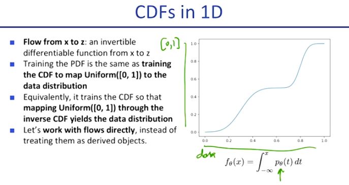 CDF function은 invertable(역으로 원래 상태로 돌릴 수 있음)하므로, 위 식의 z(noise의 누적)를 예측하더라도 동시에 x의 값과 p(x)를 예측할 수 있다. (p(x)값은 미분하여 예측이 된다)