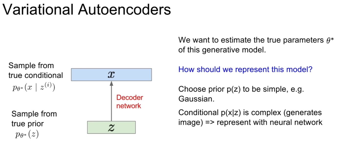 우리는 이 (가우시안 등으로 된 simple한) p(z)를 통해서 p(x|z)를 통해 이미지를 만들어낼 것이다. 이건 복잡하니까 뉴럴 네트워크로 만들게 된다. 이걸 디코더 네트워크라고 하자.