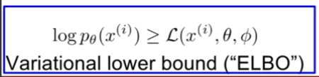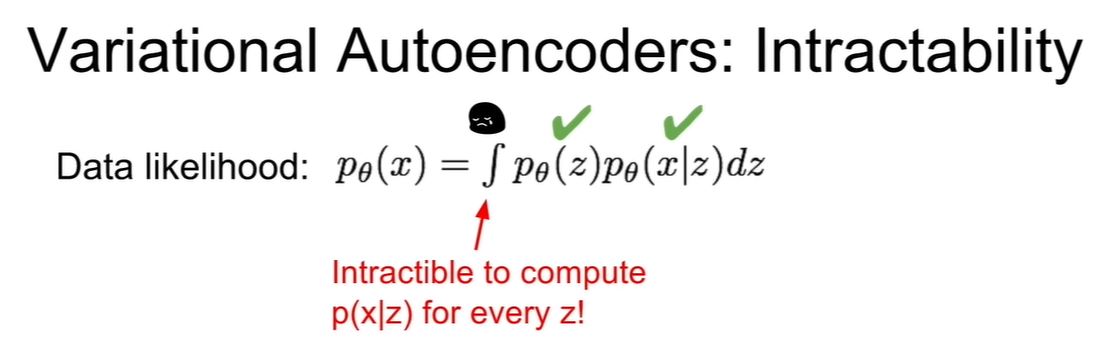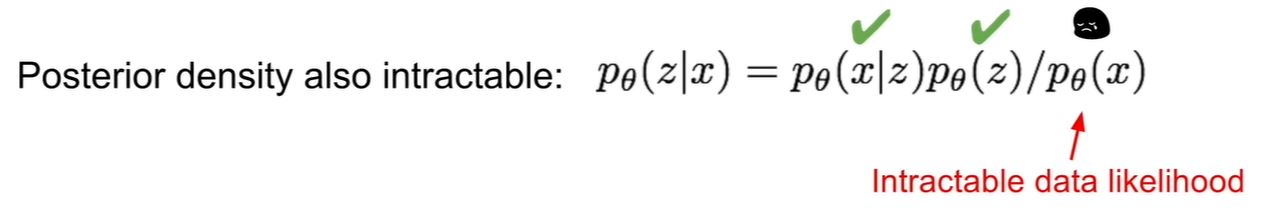 VAE는 intractable한 (조절이 까다로운?) latent(잠재) vector z에 대한 density function을 알아내려 한다.