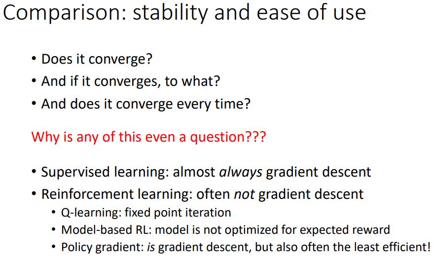 supervised learning에서는 gradient descent를 사용하기 때문에 대개 수렴 하지만 RL은 대체로 gradient descent를 사용하지 않는다.