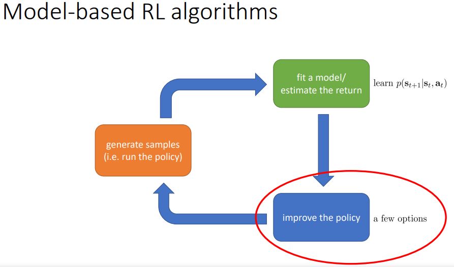 model fitting step(초록)을 포함하는 model based algorithm은 p(s_t+1|s_t,a_t)를 학습한다.