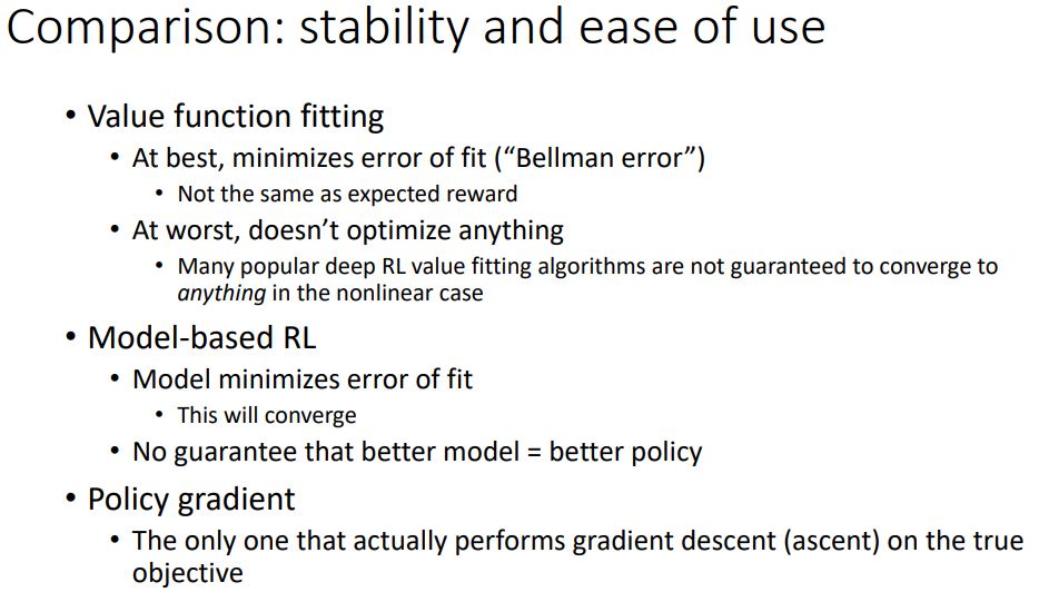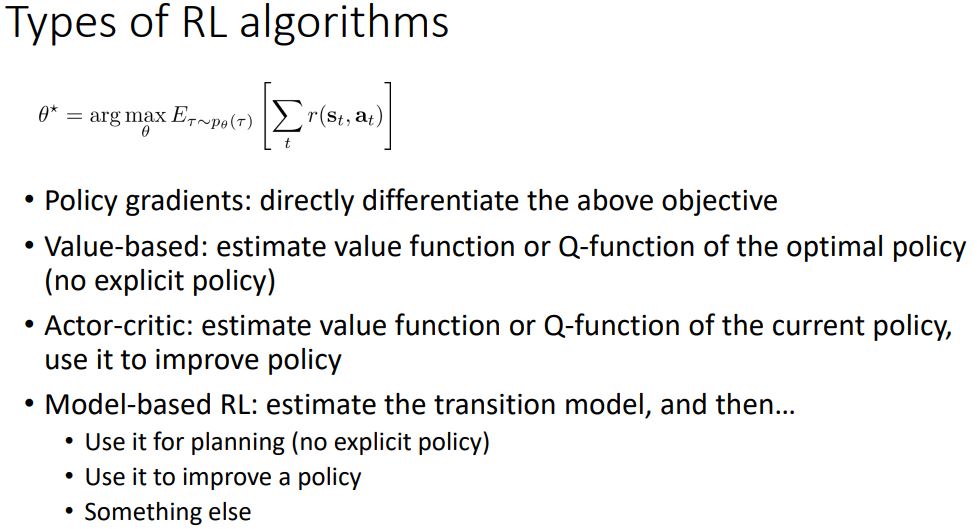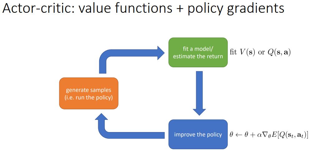 Actor-critic : 기본적으로 위의 두가지를 같이 한다. value function이나 Q-function을 추정하고, policy gradients 와 비슷한 방법으로 policy를 향상시킨다.