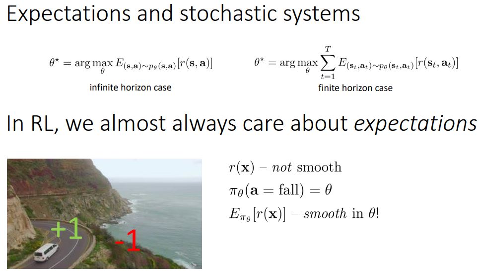 어떤 특정 경로(궤적)에 신경 쓰는게 아니라 우리가 모든 경로를 average했을 때 얻어지는 reward의 기댓값에 대해 고민한다.