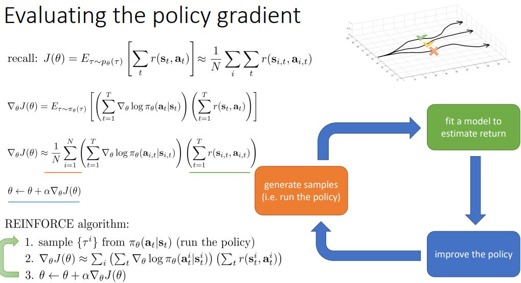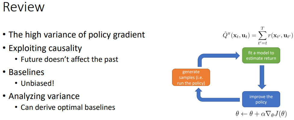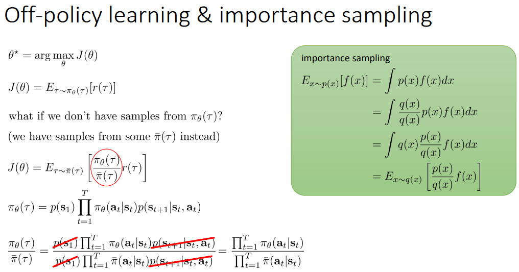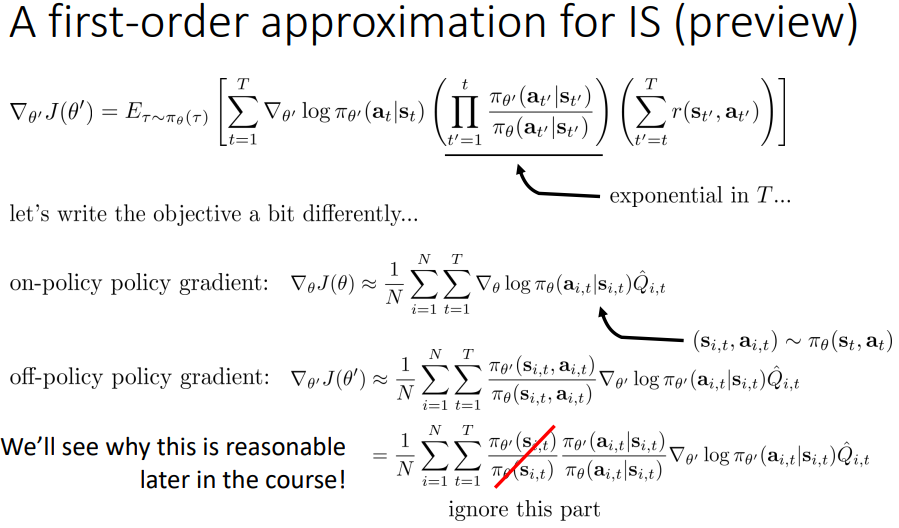남은 강의 동안에는 policy gradient가 어떻게 on-policy가 되는지에 대해 다룰 것이며 이것에 대해 무엇을 할 수 있는지 다룰 것이다.
