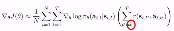 이제 리워드 타임의 t`를 바꿔본다. reward에 대한 t`=1에서 t`=t로. 왜냐하면 시간 t일 때 하는 action은 시간 1~t-1까지의 reward와는 전혀 무관하기 때문이다. 이는 여전히 policy gradient를 위한 unbiased 된 측정기라고 생각할 수 있게 된다.
