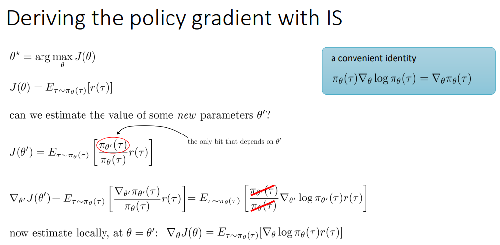 J(세타`) = ~~~~ 의 식이 좋은게, 새로운 세타`은 기댓값 안의 분자에만 영향을 끼치고 tau를 샘플링 하는 쪽이라던지 분모에는 영향을 끼치지 않는다. 미분하며는 그 아랫줄의 오른쪽이 되고, 만약 지역적으로 세타 = 세타`같은 곳이 있다면 결국 우리는 예전 우리가 봤던 그 식으로 돌아올 수 있으며 이론적으로는 off policy 된 상태가 된다.