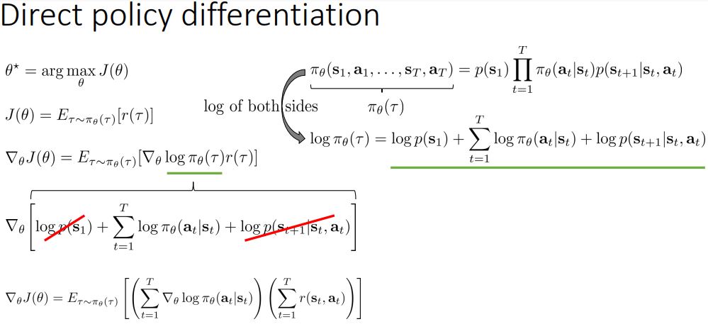 세타에 대한 미분인데 그렇기 때문에 log p(s_1) 이나 log p (s_t+1 | s_t, a_t) 는 사라진다.