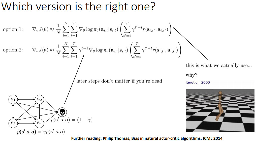 오른쪽 MDP(markov decision process)를 보면 영원히 무한으로 돌아다닐 수 있는데, reward가 0에 수렴하면 death state로 빠질 수 있는 state를 추가했다. (death state의 reward는 0이다)