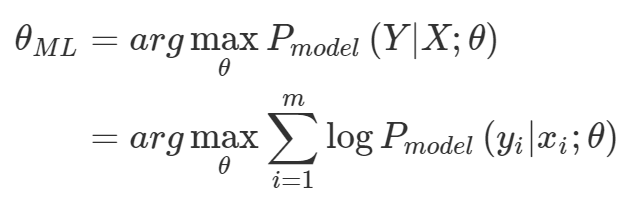 θ_ML = arg max_θ P_model(Y|X;θ) 인 것이며 이를 log를 붙여서 arg max_θ sum(1~m) (log P_model(y_i | x_i;θ )로쓰기도한다.
