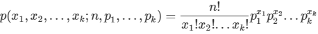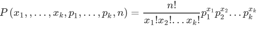 다항분포(multinormal distribution)란 k개의 서로 다른 상태를 가질 수 있는 하나의 이산확률변수에 대한 확률분포를 가리킨다. (즉 어떤 이산확률분포의 가능한 상태가 k개라는 뜻.) 그리고 이 때 각각의 확률이 p_1,p_2,p_3,....p_k일 때 n번의 시행에서 i번째의 값이 x_i회 나타날 확률은 다음과 같다.