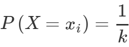 균등분포를 예로 들어보자. 균등분포는 각 상태에 해당하는 확률이 동일한 확률분포를 가리킨다. k개의 서로 다른 상태를 가진다고 할 때 균등분포를 따르는 이산확률변수 X의 확률질량함수는 아래와 같다.