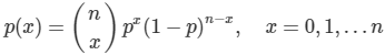 성공확률이 p인 베르누이 시행을 n번 반복할 때, 성공횟수를 나타내는 확률변수 X의 분포를 이항분포(binomial distribution)이라고 한다. 이항분포의 Probability density function은 아래와 같다.