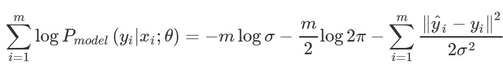 그리고 아까 위의 P_model 이 가우시안 확률함수라고 가정해보자. ( 다시 말해 X와 Y가 정규분포를 따를 것이라고 가정 해 보는 것이다. ) 그러면 정규분포 확률함수로부터 이 모델의 sum of log likelihood 는 아래와 같이 된다.