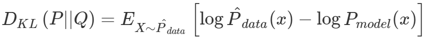 우리가 가진 학습데이터의 분포를 P_data, 모델이 예측한 결과의 분포를 P_model, 모델의 모수(파라미터)를 θ라고 두면 Maximum Likelihood Estimation은 다음과 같이 쓸 수 있다. 이때 Expection 안에 log가 들어간 이유.2u는 엔지니어링 적인 이유로, 만약 1보다 확률을 지속적으로 곱한다면 언더플로우 문제가 발생하기 때문에 취하는 것이다. 다만 전체 값에 로그를 취하거나 scale 을 변화시켜도 대소는 변하지 않기 때문에 두 식이 동일한 의미를 갖게 된다.