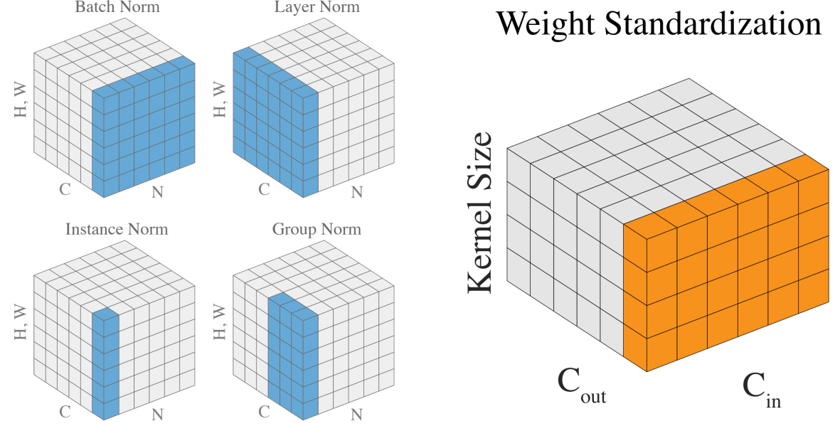 Weight Standardization의 경우 각 conv filter의 mean을 0 , variance를 1로 조절해준다. (아래 그림 참고)