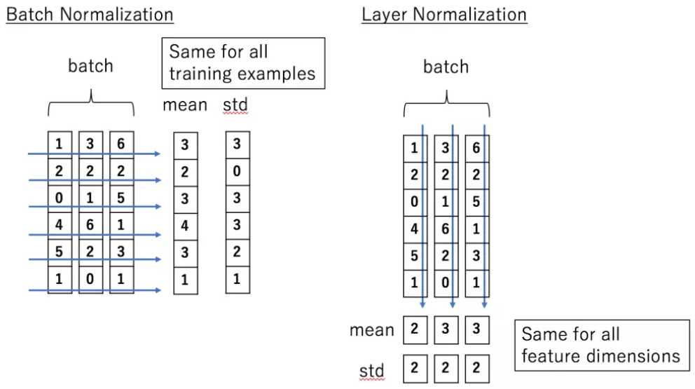 배치놈은 기존의 배치들을 normalization했다면, Layer normalization은 Feature 차원에서 정규화를 진행한다.