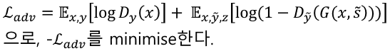 1. GAN 에서 사용하는 adversarial loss를 적용한다. real/fake discriminator를 사용하여 G/D에 대해 : log(D(x)) + log(1-D(G(x,c)))